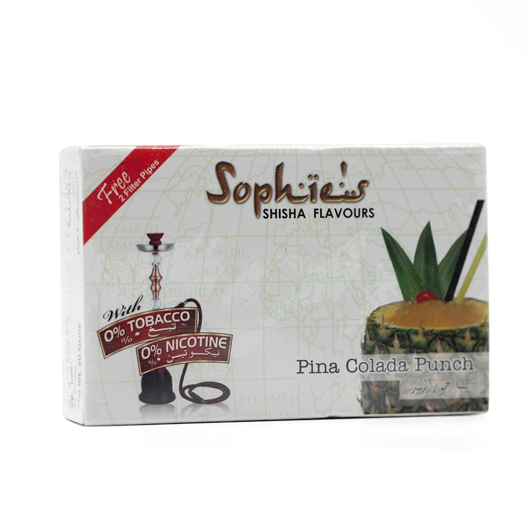 Sophies Pina Colada Flavoured Molasses is 100% Tobacco Free. The Pina Colada flavour is sure to create an authentic Hookah experience for you and your friends. 50g Box size 95mm x 60mm x 20mm