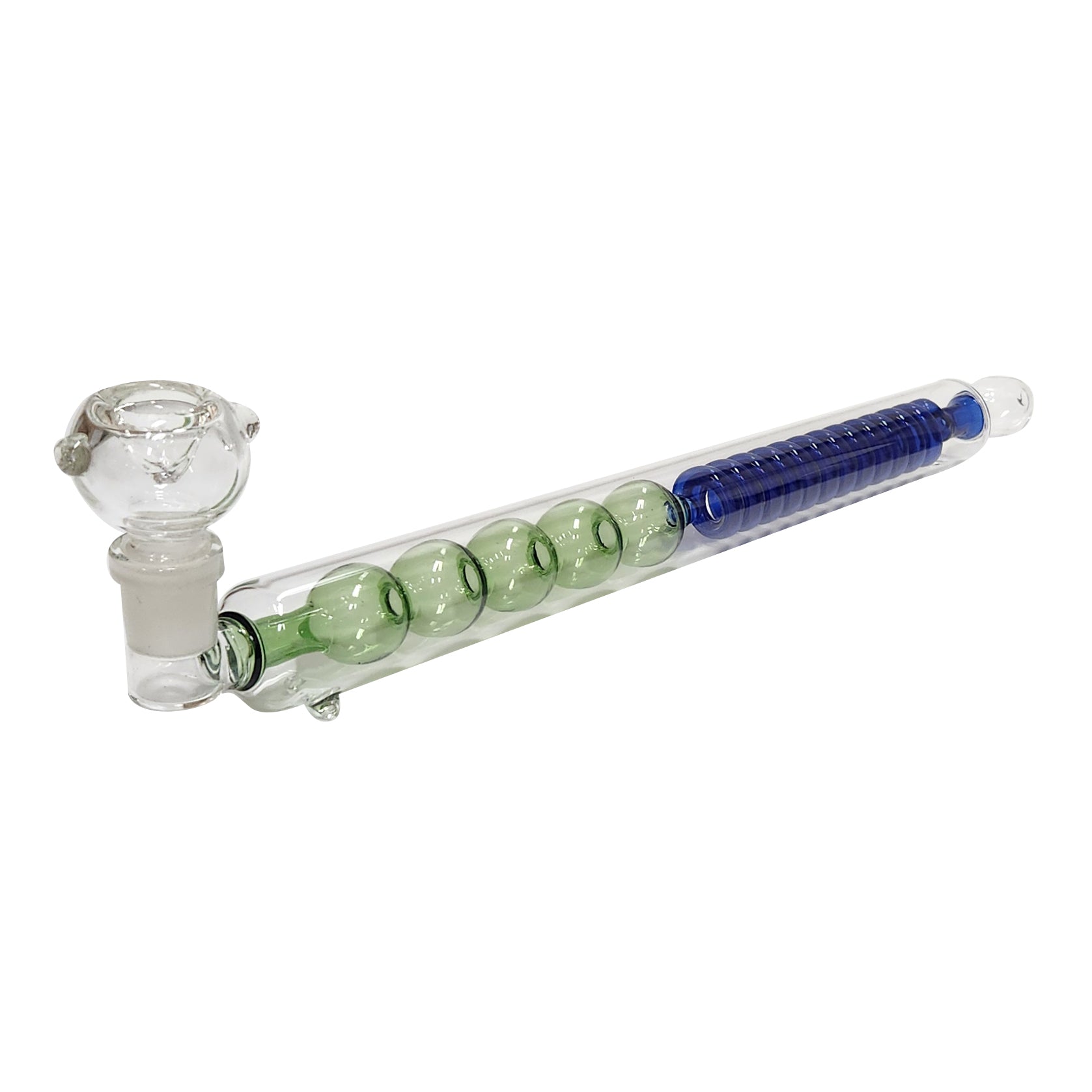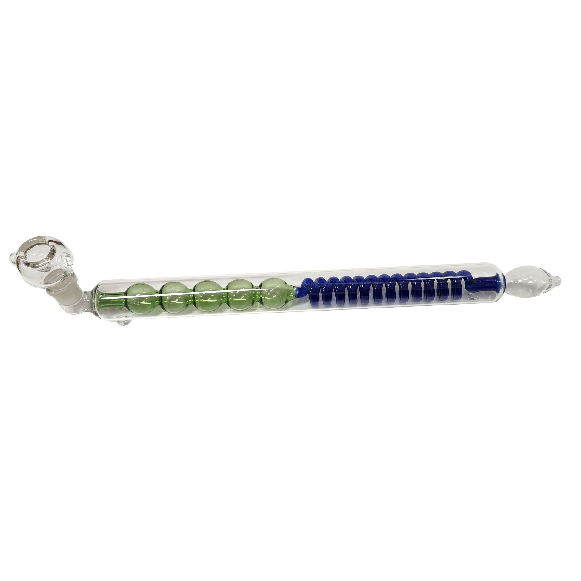 Make a bold statement with this eye-catching glass pipe, featuring a long, sleek design enhanced by a vibrant blue spiral that twists elegantly around the body. The standout feature is the series of five smooth glass bubbles, giving the piece a distinctive look while offering a comfortable grip and added cooling as the smoke travels through.