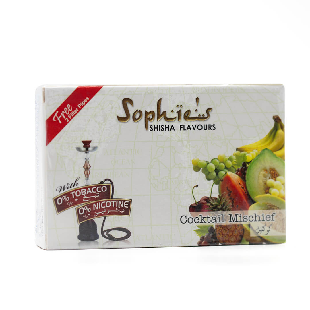 Sophies Cocktail Mischief Mix Fruits Flavoured Molasses is 100% Tobacco Free. The Cocktail Mischief Mix Fruits flavour is sure to create an authentic Hookah experience for you and your friends. 50g Box size 95mm x 60mm x 20mm